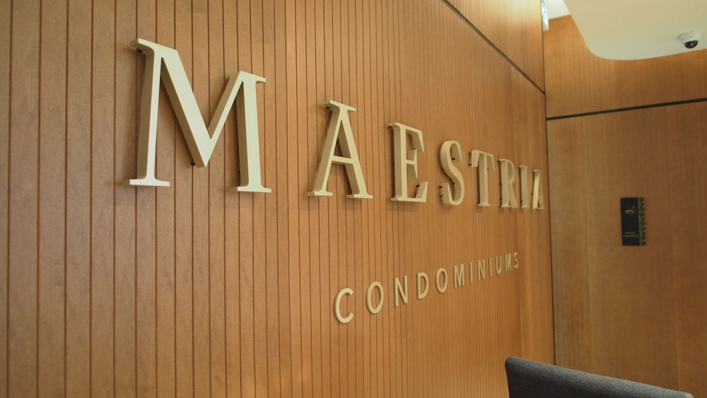 In the heart of the vibrant downtown core, within the Quartier des Spectacles, now stand the tallest residential towers in Montreal. These two majestic towers rise in harmony to 58 and 61 floors and are connected by the highest skybridge ever built in Quebec. Given its scale, Maestria required a comprehensive, clear, and efficient signage system. It includes a range of panels to provide directional guidance, identify key destinations, and regulate the environment, including evacuation plans. Additionally, an information leaflet was created to provide new residents with a navigation tool to help them find their way easily. The developed signage system blends seamlessly with Maestria’s luminous, luxurious, and refined environment. The chosen typeface features an Art Deco touch, reflecting the artistic inspiration at the heart of Maestria. The signage elements combine black and gold, and the larger plaques feature a delicate pattern reminiscent of certain architectural details of the project.