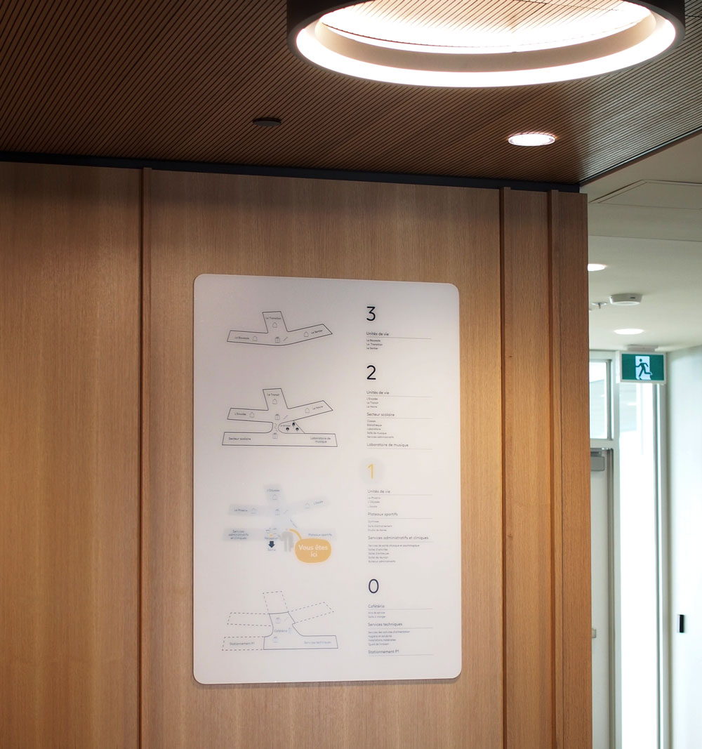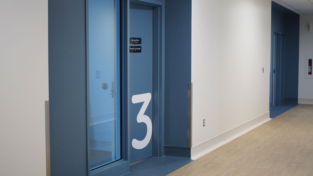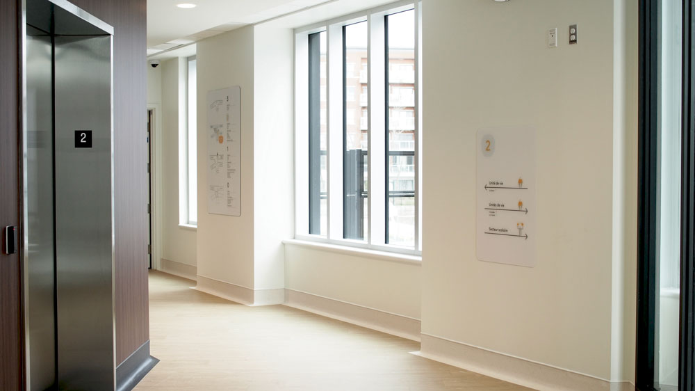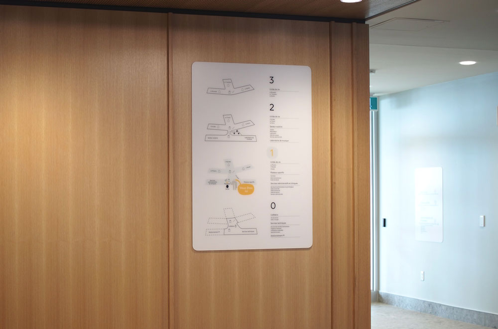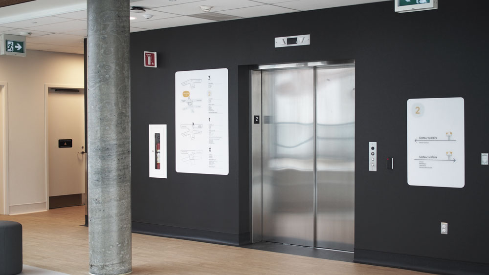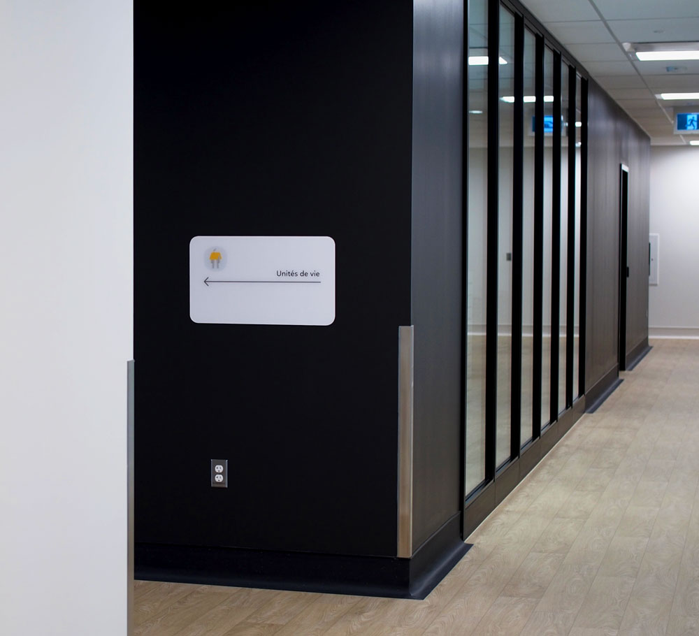 Le projet de construction du Centre de réadaptation pour jeunes en difficulté d’adaptation (CRJDA) de Sainte-Thérèse se veut un milieu de vie transitoire où les jeunes seront guidés vers une réintégration sociale réussie. Le complexe, imaginé par ACDF, offre 90 places d’hébergement et inclut de nombreux services telles une pharmacie, des services cliniques, des salles de classes, un gymnase, une bibliothèque, une cafétéria, des parcs extérieurs et bien plus. Notre mandat consistait à élaborer le volet graphique, le développement technique et la planification finale de l’ensemble de la signalisation (intérieure, souterraine et extérieure) pour ce site totalisant une superficie intérieure de 12 000 m2 et un aménagement extérieur de 9700 m2.Comme l’endroit soutient une circulation importante, accueille une clientèle particulière et que celle-ci sera amenée à changer au fil du temps, une attention particulière a été portée à la durabilité et robustesse des éléments de signalisation. Au total, ce sont des milliers d’items qui ont été produits et installés pour répondre aux besoins spécifiques du site.